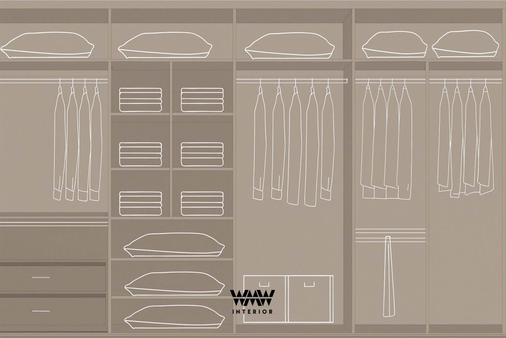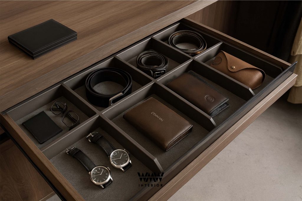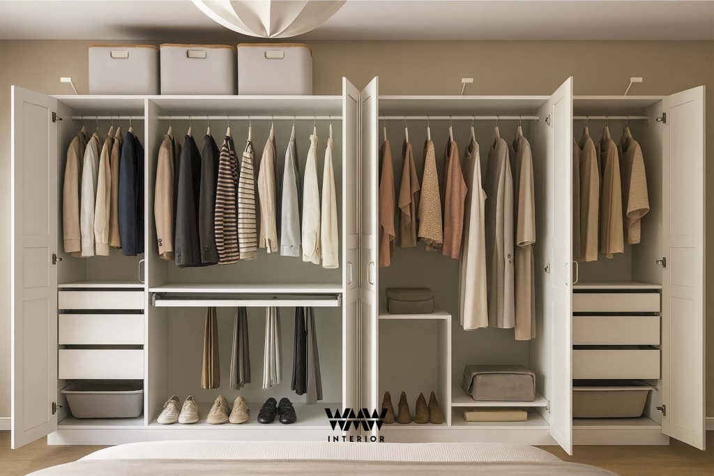 • Sesuaikan layout wardrobe dengan kebutuhan (lebih banyak gantungan, rak, atau laci).