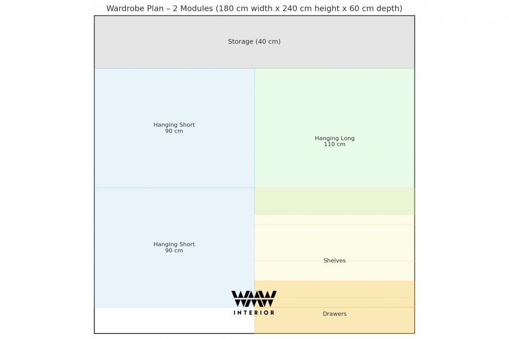 Artikel ini membahas ukuran wardrobe standar, tips pembagian area gantungan, rak, hingga laci, serta contoh sketsa visual untuk wardrobe 1 modul dan 2 modul.